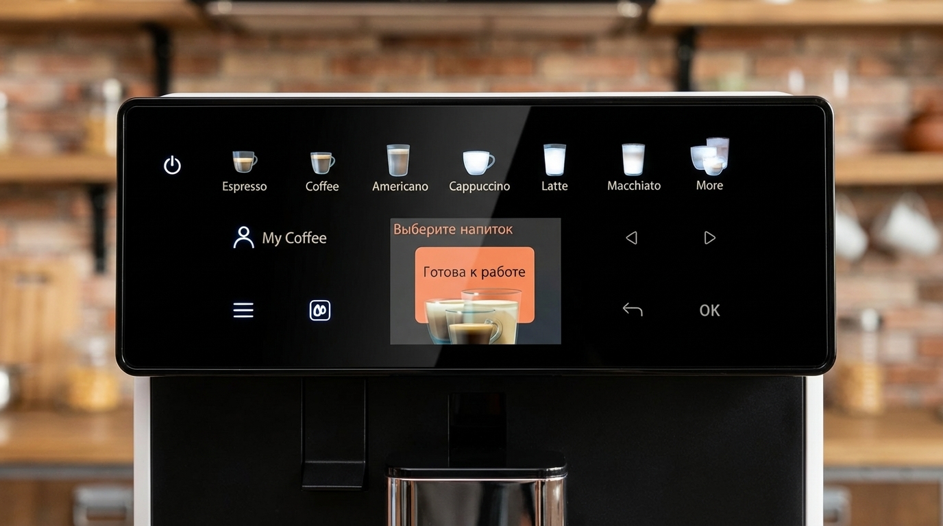 2,4-дюймовый экран для машины за 50 тысяч — приятный бонус. 15 сенсорных кнопок, из которых 6 запускают напитки в одно касание. Но тут есть нюанс, на который жалуются владельцы: активная зона кнопок очень маленькая. Нужно попадать точно в центр под иконкой, иначе реакции не будет. К этому привыкаешь, но первую неделю раздражает.
