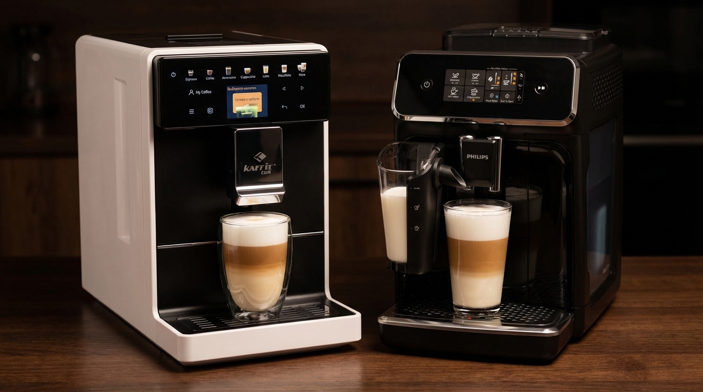 Philips с системой LatteGo — прямой конкурент по функционалу автокапучино. Молочная система похожа по принципу, но реализация у Philips стабильнее. Съёмный заварочный узел даёт преимущество в обслуживании. Однако Philips заметно дороже и габаритнее. Kaffit A5 берёт ценой и размерами.