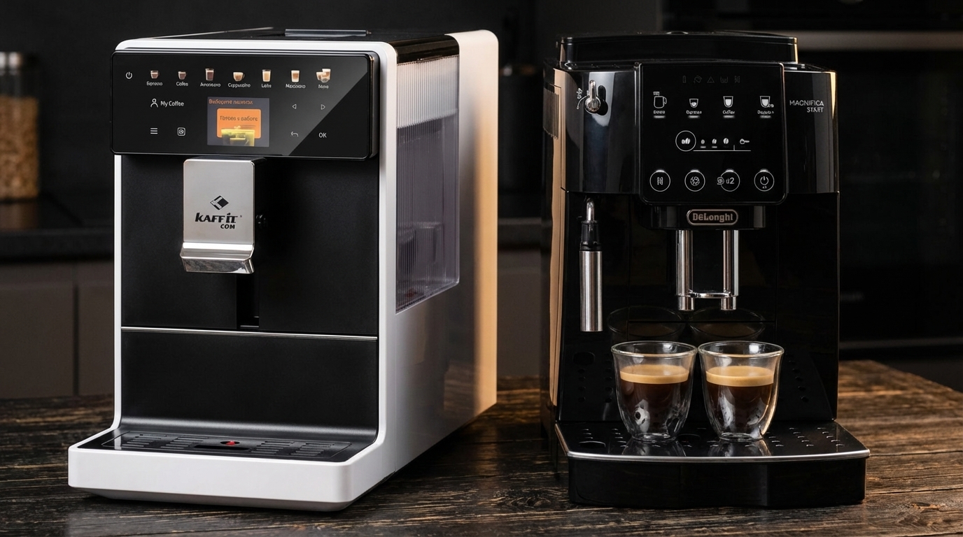 DeLonghi Magnifica Start — ближайший конкурент по цене. Классический съёмный заварочный узел, который можно промыть под краном. Экстракция чёрного кофе стабильнее за счёт обычной граммовки. Но — нет автоматического капучинатора в базовой версии, только ручной панарелло. По компактности Kaffit выигрывает с заметным отрывом.