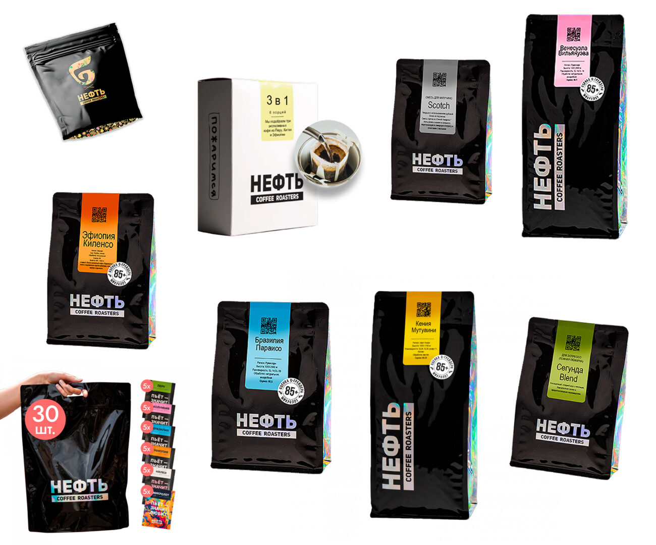 Кофе в зёрнах (светлая и средняя обжарка — моносорта, микролоты, бленды), смеси с робустой линейки «Баррель» (бюджетный сегмент), дрип-пакеты, аксессуары, мерч.