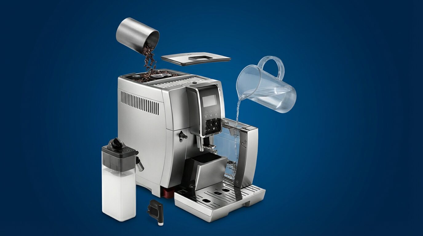 DeLonghi Dinamica — серия суперавтоматических кофемашин среднего класса, пришедшая на смену заслуженным моделям 23-й и 25-й серий. Мы изучили всю линейку — от бюджетной ECAM 350.15 до флагманской 370.95 с цветным сенсорным экраном и управлением через смартфон — и разобрались, где проходит реальная граница между «экономией» и «вложением в качество».