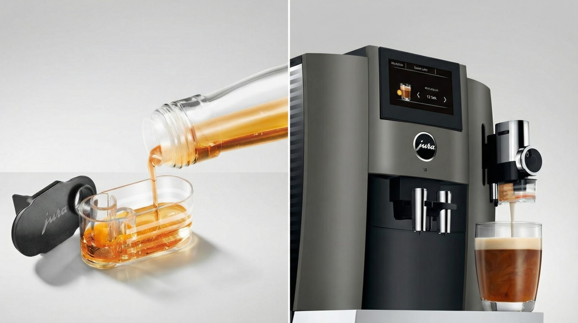 Пожалуй, самая обсуждаемая функция серии. Специальная съёмная насадка позволяет подмешивать кофейный сироп прямо в процессе вспенивания молока. Сироп не оседает на дне, а распределяется по всему объёму — достаточно 5–10 мл для выраженного вкуса. Контейнер разборный, можно мыть в посудомоечной машине. У E8 этой функции нет: сироп придётся добавлять вручную.