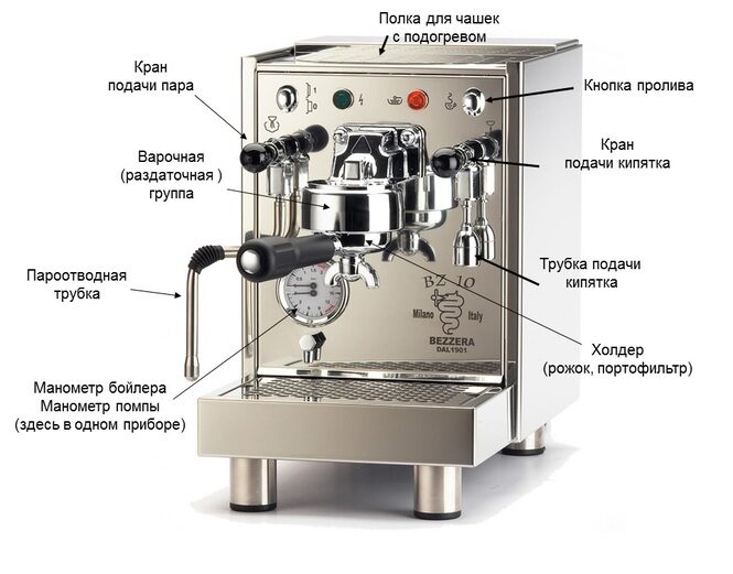 Обозначение основных составляющих устройства рожковой кофемашины